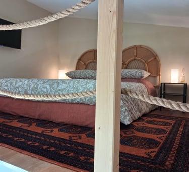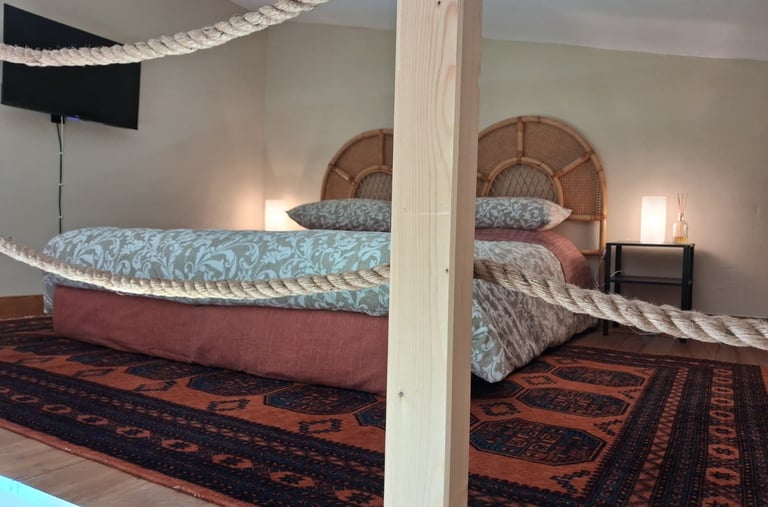 Un accogliente soppalco in legno con letto matrimoniale, ideale per una fuga romantica. Goditi il comfort e la bellezza della natura circostante in un ambiente rilassante.
